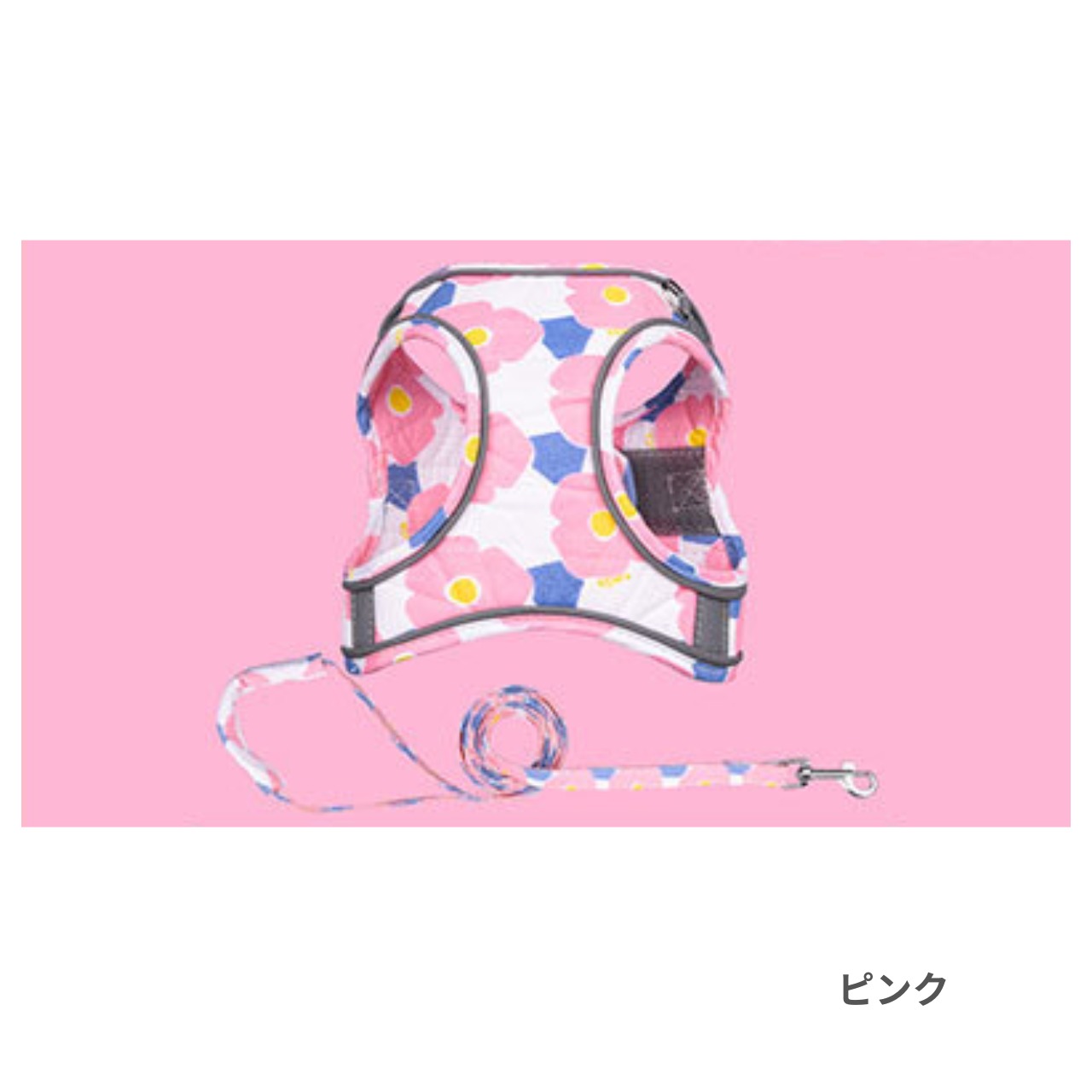 ポップで可愛いフラワープリントのハーネスとリードのセットは、お散歩タイムをもっと楽しく彩ります。